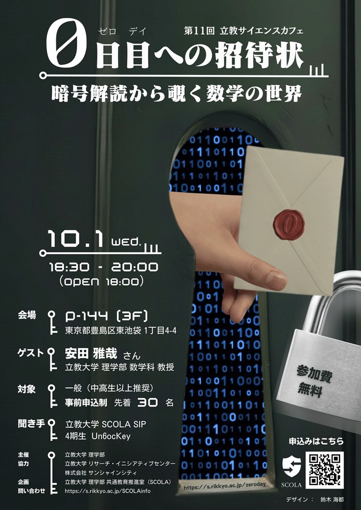 10月1日(水)に立教大学 SCOLAが手掛ける立教サイエンスカフェ「0日目への招待状 ~暗号解読から覗く数学の世界~」をP-144 3階にて開催!